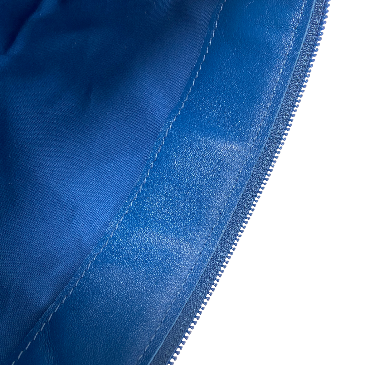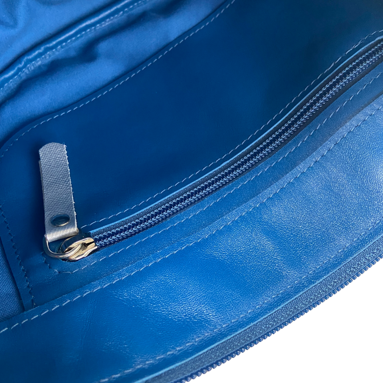Het tasje is gevoerd met een blauwe voering en heeft een binnenzak met rits, alles in blauw.
