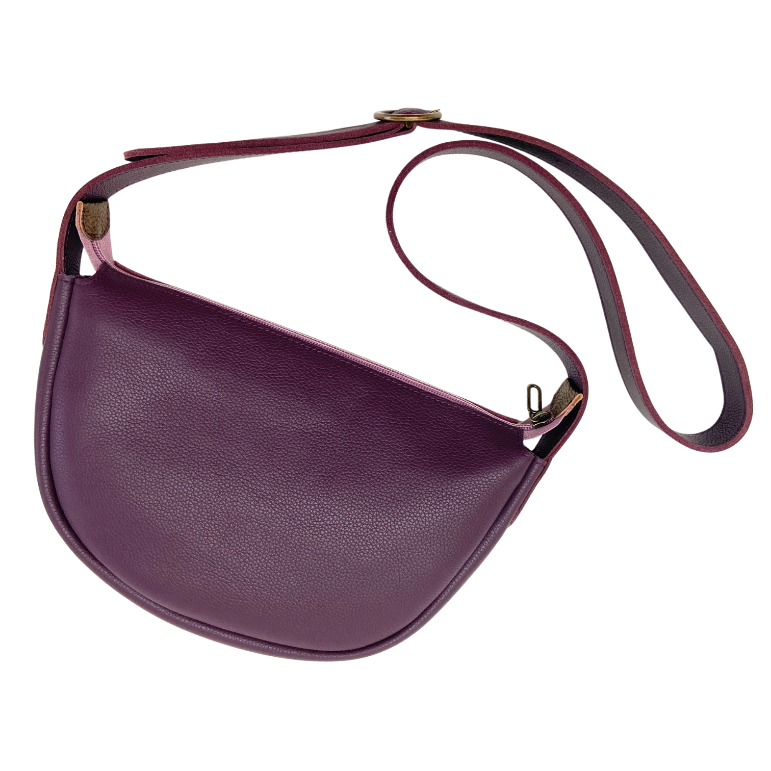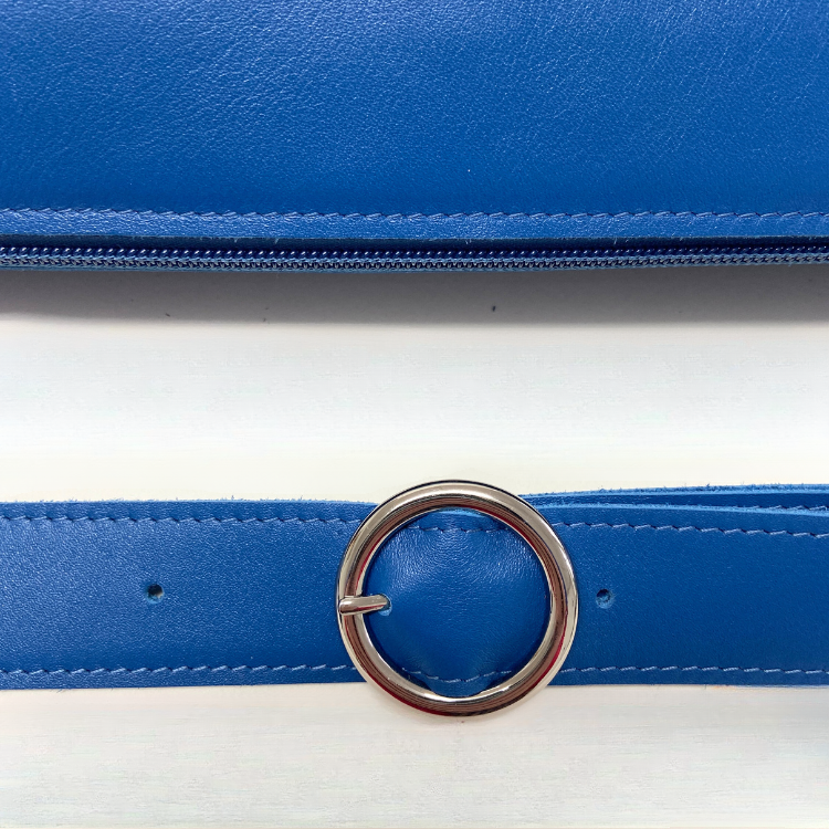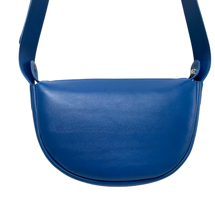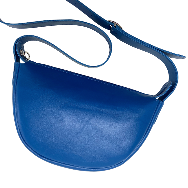Halfronde tas van soepel blauw leer. Mooie afwerking van de rits.